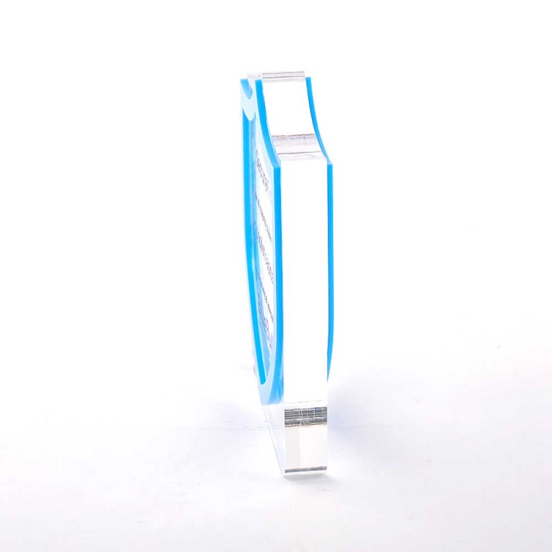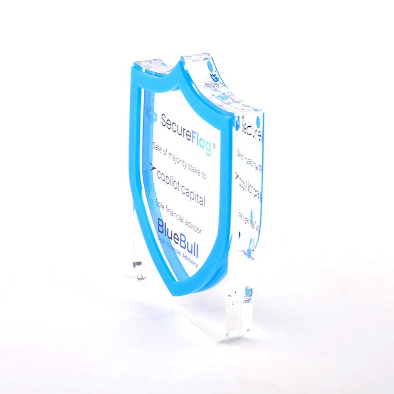 Blocs corporatifs avec cadre silhouettés au laser et fabriqués à la main avec des plaques de plexiglas transparent et bleu (Plexiglas®-PMMA). Impression numérique et encres ECO-UV de haute qualité pour les textes et les logos, grande netteté des couleurs et grande profondeur sur la face avant. Bords lisses, polis, incolores et très brillants grâce à nos procédés de fabrication soignés.