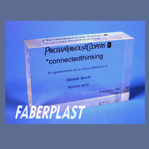 Bloc corporatif PRICEWATERHOUSECOOPERS, produit en Méthacrylate transparent et decoré avec de la serigraphie.