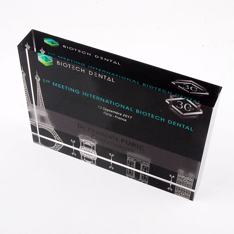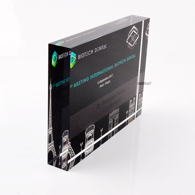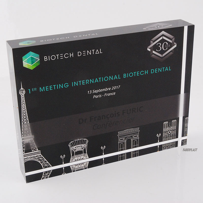 Bloc plexiglas d'entreprise fait que les société BIOTECH DENTAL. Il est une plaque méthacrylate transparent (Plexiglas-PMMA) avec une courbure et imprimé par impression digitale directe conception de haute qualité, des logos et des textes fournis par le client. Aucun adhésif et une finition élégante.