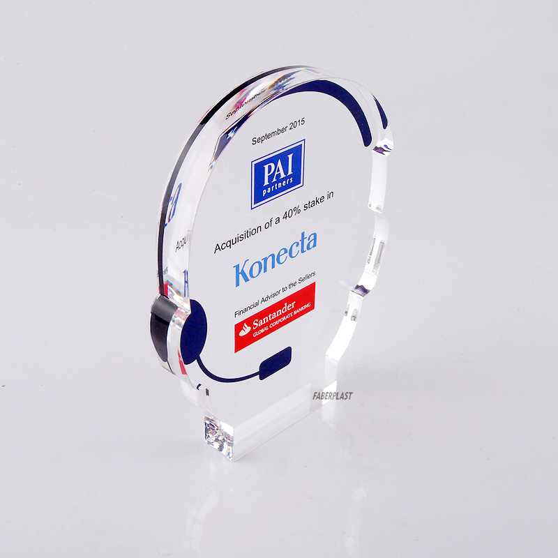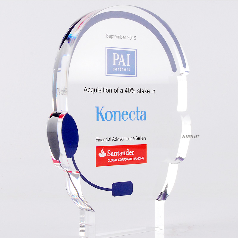 Bloc plexiglas pour l'entreprise KONECTA fait sur mesure. Panneaux en méthacrylate transparent (Plexiglas-PMMA) de haute épaisseur, la forme silhouettent par laser selon la conception du client et l'impression digitale directe de haute qualité.