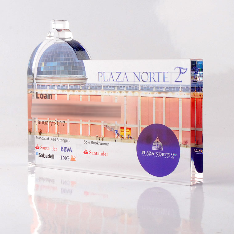 Bloc plexiglas comme forme Plaza Norte 2 profilant par laser. Panneaux en plexiglas transparent (Plexiglas-PMMA) d'épaisseur élevée. Il comprend duplex digital directe avec la conception fournie par le client et les logos des entreprises associées.