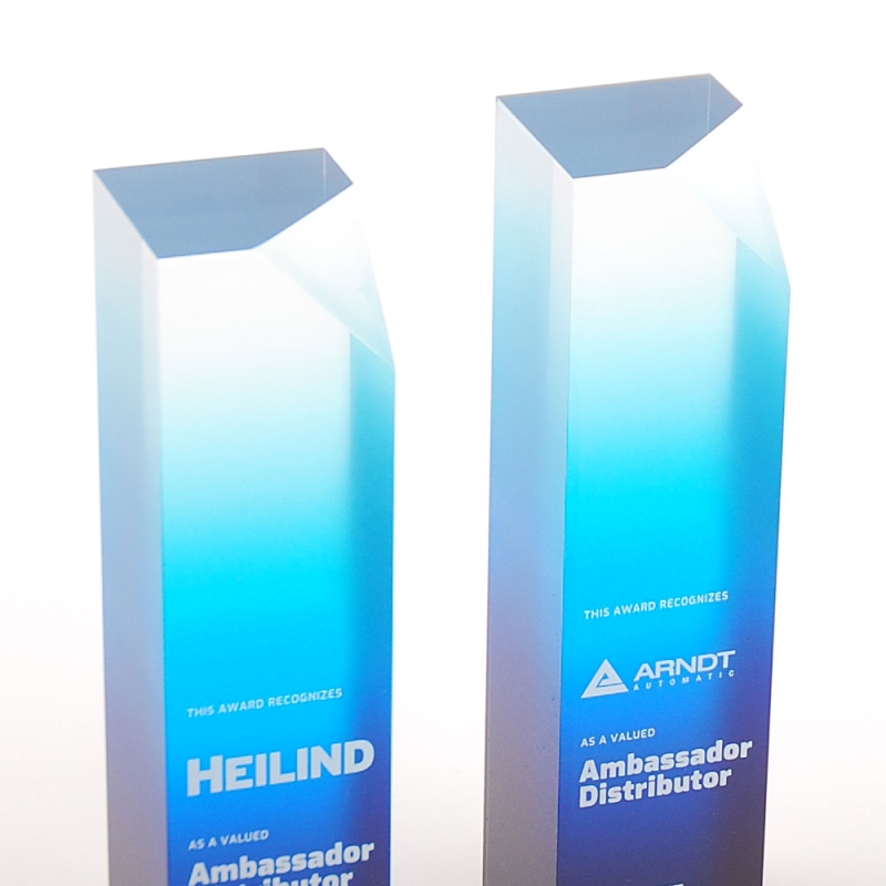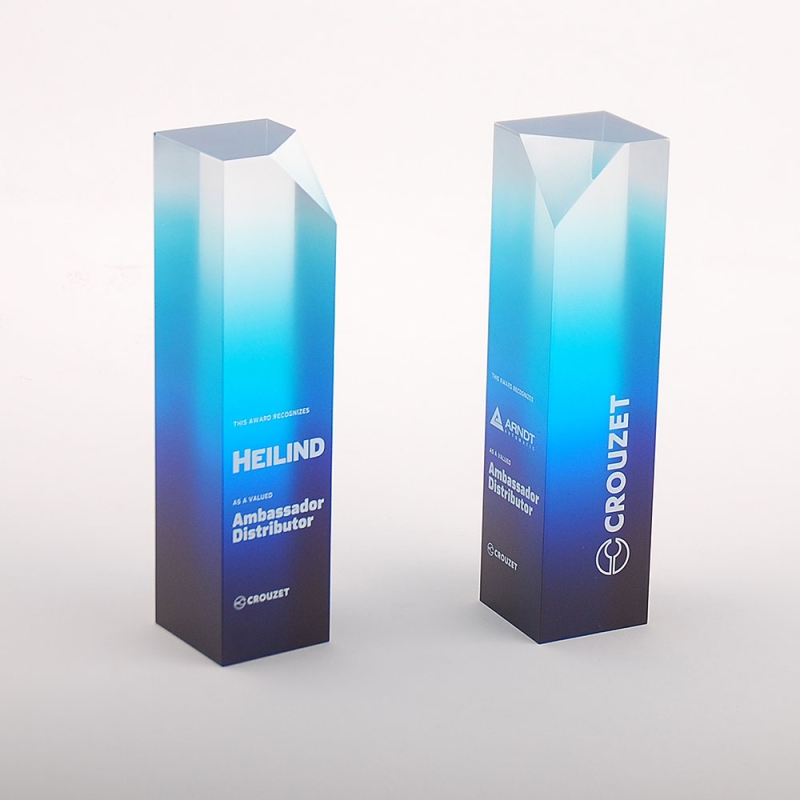 Trophées personnalisés en format bloc avec angle chanfreiné réalisés de manière artisanale avec du méthacrylate transparent (Plexiglas®-PMMA) de forte épaisseur. Ils comportent une impression numérique au moyen d'encres ECO-UV semi-translucides de haute qualité et résistance, avec une grande netteté des couleurs. Bords lisses, polis, incolores et très brillants.