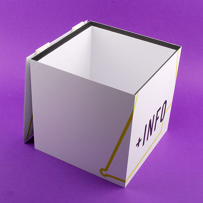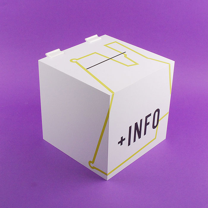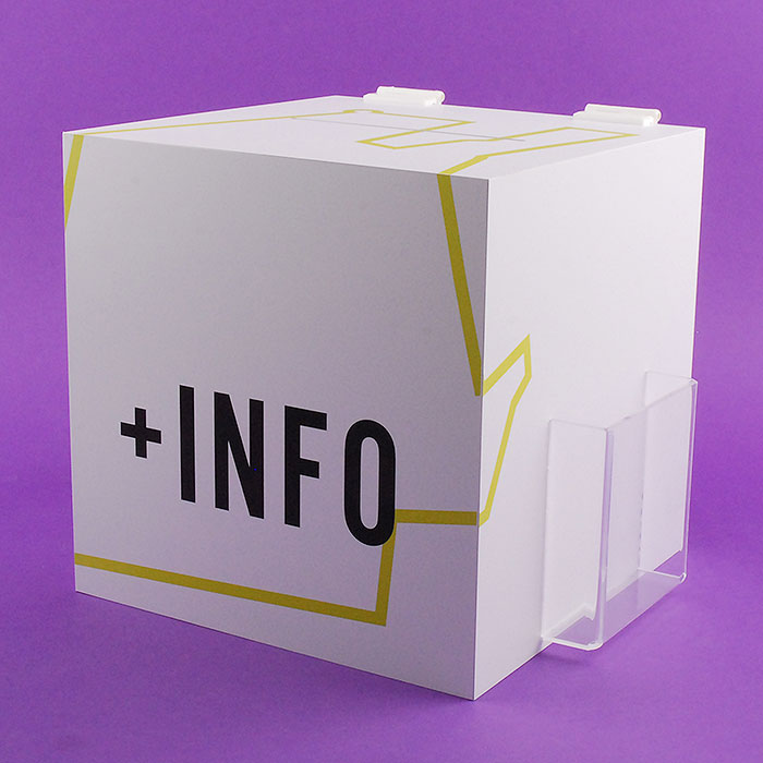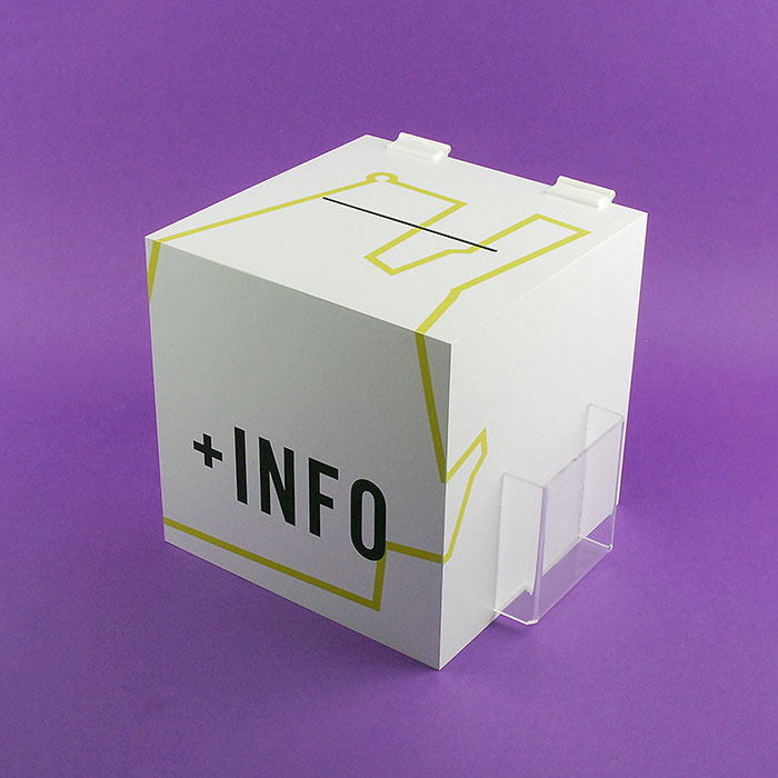 Fabrication à la main avec des plaques de PVC moussé blanc mat (Foamlyx). Construit avec un porte-brochure en méthacrylate transparent (Plexiglas-pmma), impression de texte numérique et design fournis par le client, serrure, grande fente pour la saisie d'informations et charnières blanches.