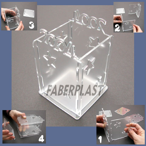 Bureau Goblet pour stylos, crayons, etc... Conception et développement pour la campagne 2003-2004 Noí«l FABERPLAST. Plexiglas (pmma-méthacrylate) fait Premium. Modí¨le de montage manuel entií¨rement démontable et facile