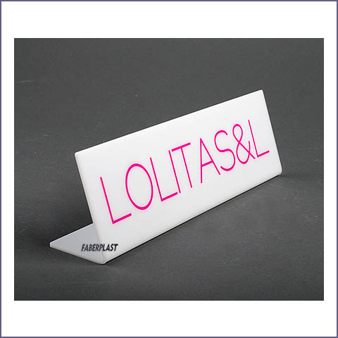 Format daffichage de bureau indicateur de marque. Fabriqué en acrylique plexiglas (pmma-methacrylate) et décorée avec un lettrage blanc brillant dans une sérigraphie couleur.