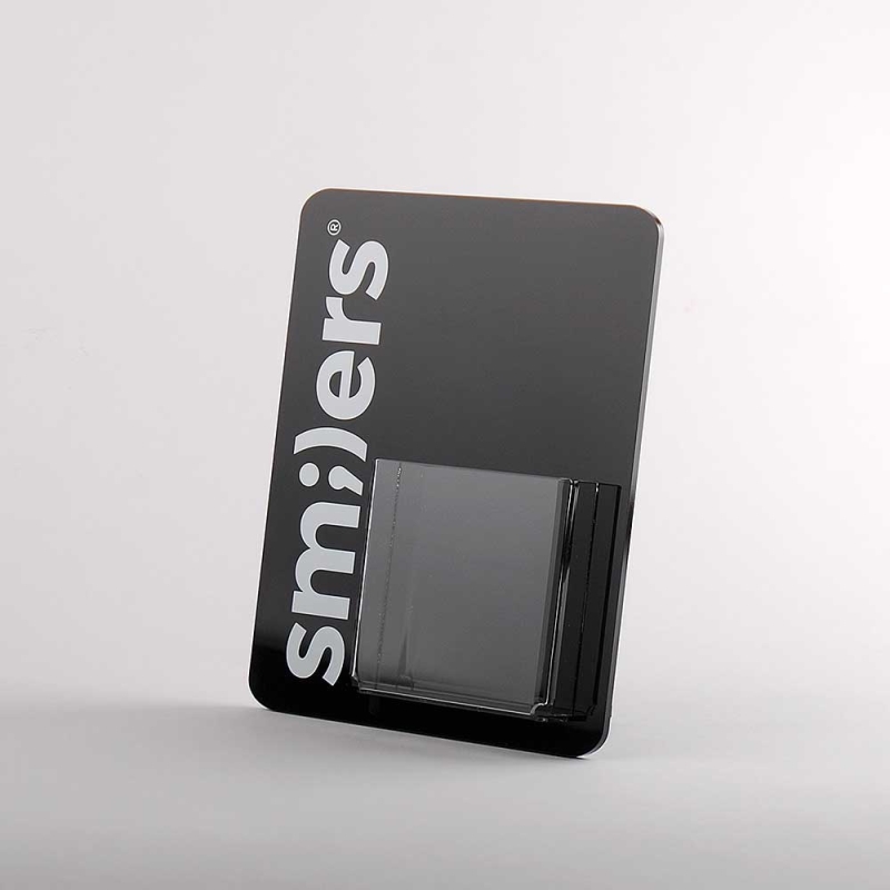 Ce présentoir moderne en acrylique, conçu pour être posé sur une table ou un comptoir, est doté d'un support vertical avant transparent. Il permet une présentation organisée et élégante des brochures, catalogues, cartes de visite et autres supports promotionnels de la marque SMILERS. Sa structure associe une base stable en acrylique noir opaque et brillant à un compartiment avant transparent offrant une visibilité optimale des documents. L'impression numérique à l'encre blanche ECO-UV, de haute qualité et durable, garantit une clarté et une profondeur de couleur exceptionnelles.