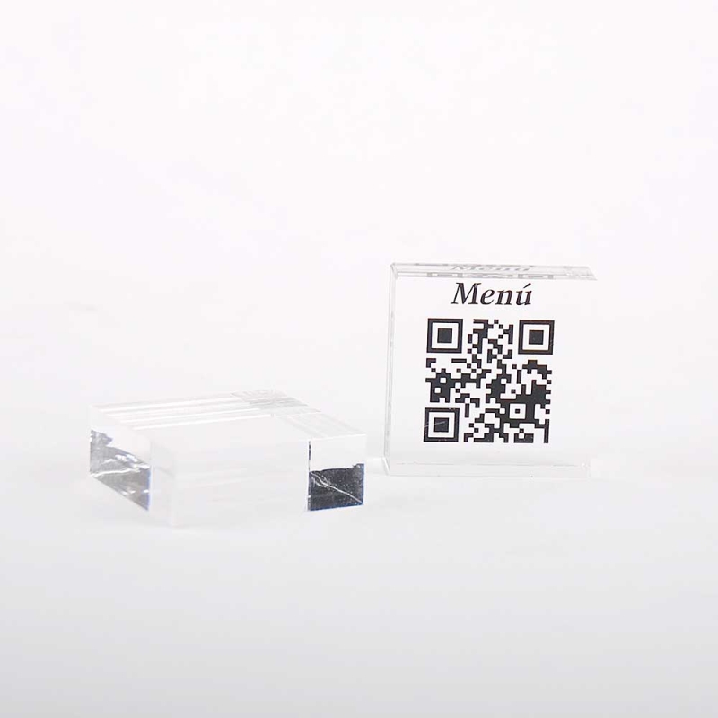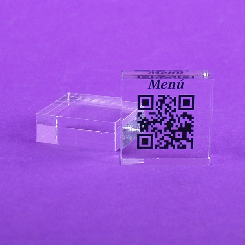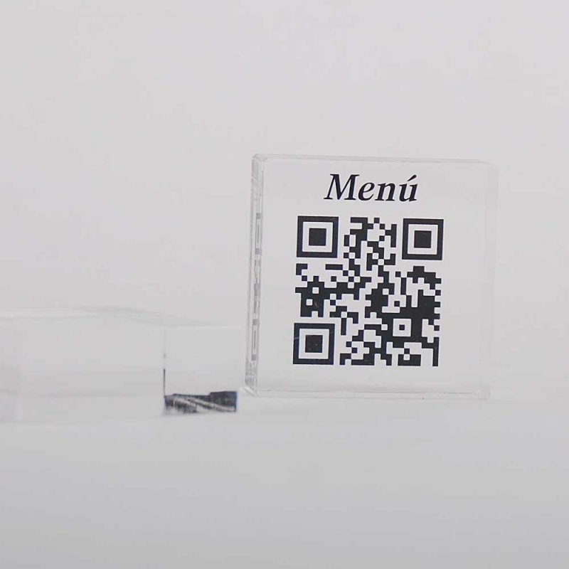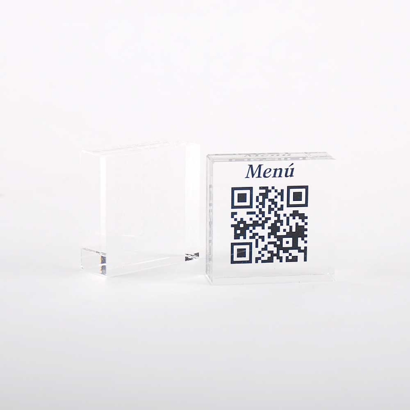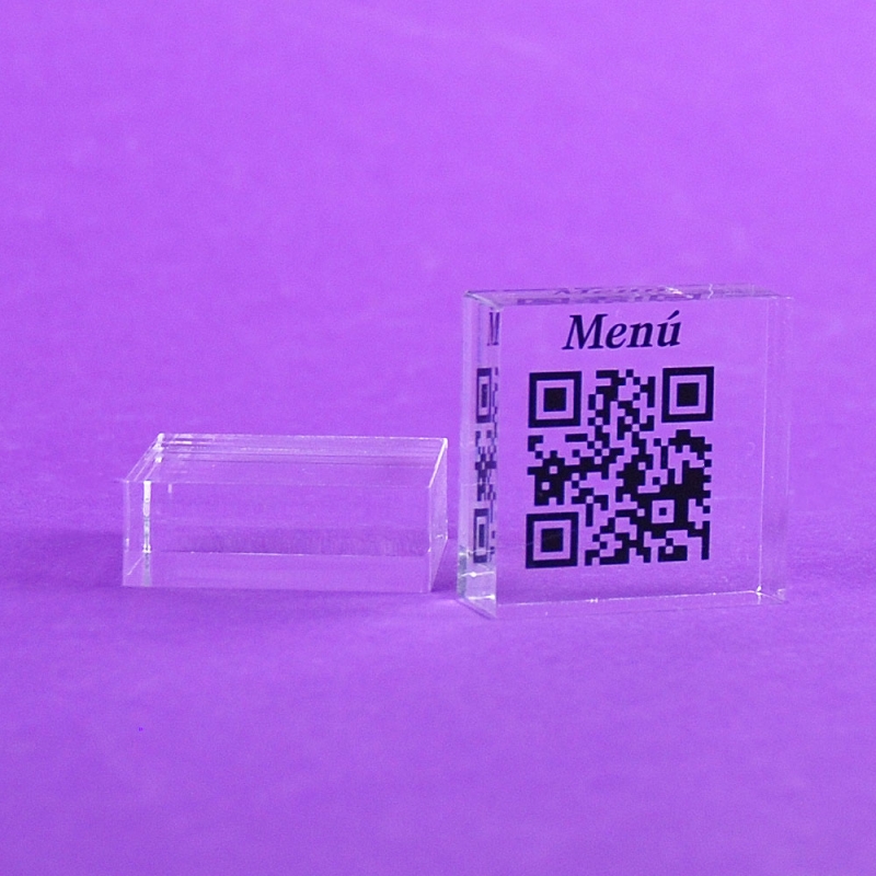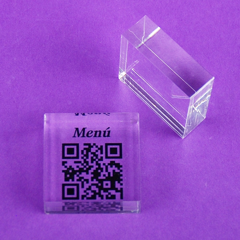 Lettres et menus QR RESTAURANT imprimés sur des plaques de méthacrylate de différentes formes à placer sur des tables, des bars ou des comptoirs. Fabriquées à la main par nos spécialistes techniques. Votre QR bien présenté avec la haute qualité d'un matériau noble comme le méthacrylate.