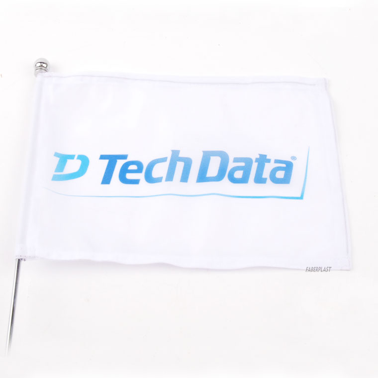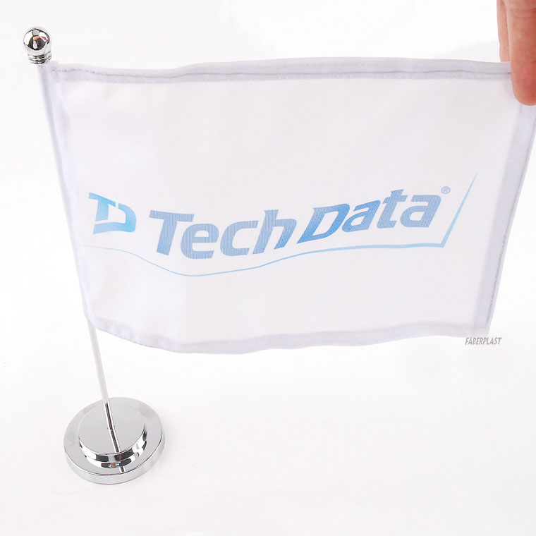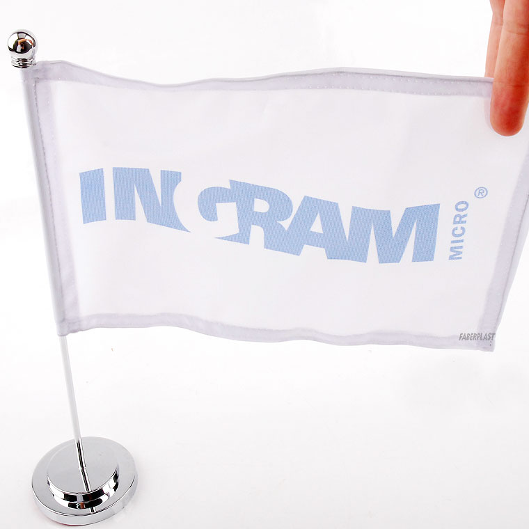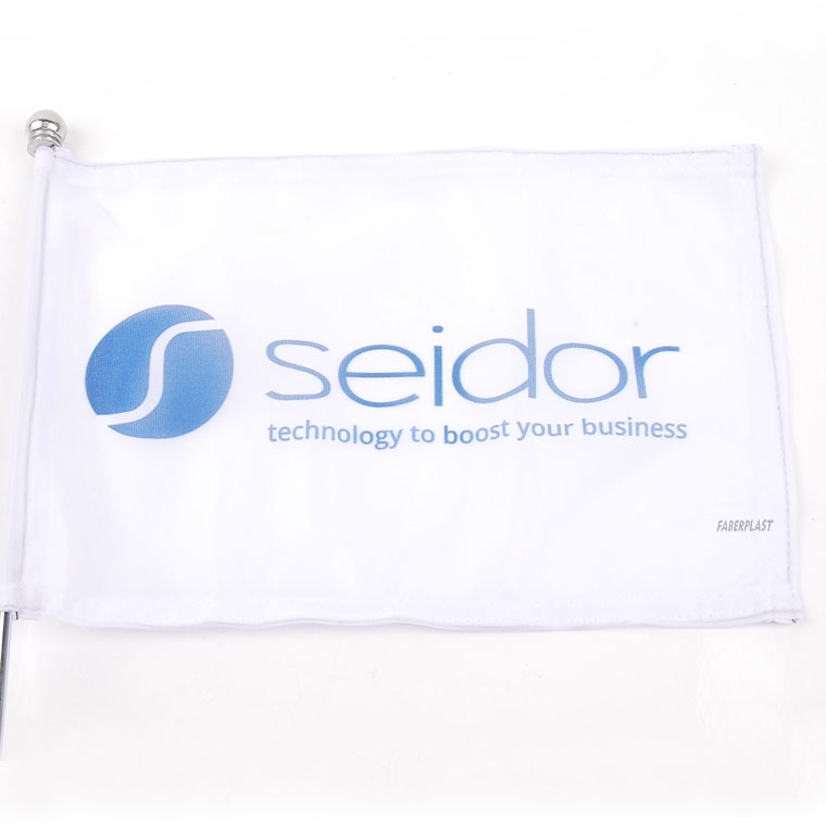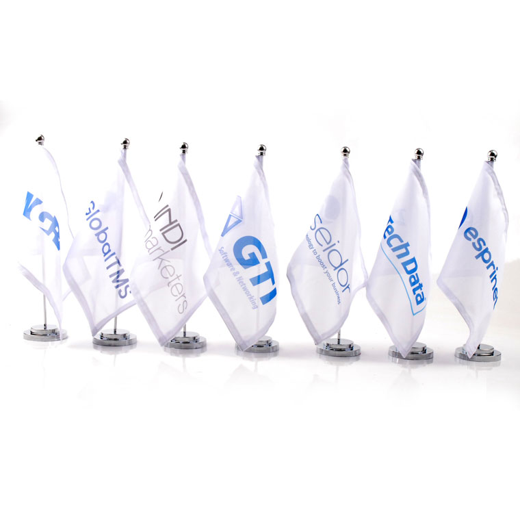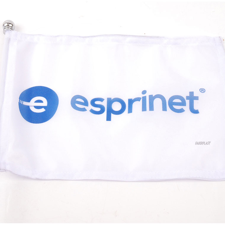Avec base et structure en plastique, et drapeau en polyester de 115 grs / m2. Imprimé en numérique avec différents logos sur une encre fournie par le client.
