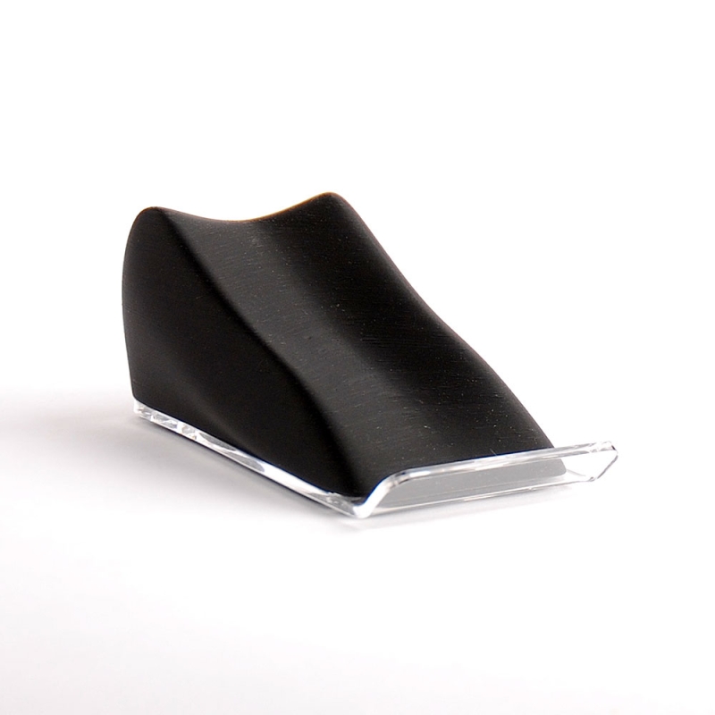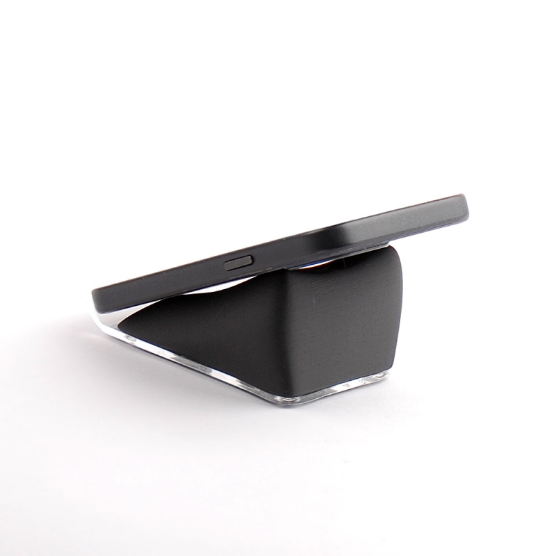 Support pour téléphone portable fabriqué à la main avec des plaques de plexiglas transparent (Plexiglas®-PMMA) et de PLA (acide polylactique) noir mat avec de la fibre de carbone en utilisant la technologie d'impression 3D FDM de qualité. La base a des bords lisses et est polie avec un vernis incolore extra brillant.