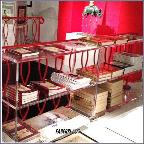 Des meubles lourds paroi Musée Cervantes de Paris. Des étagí¨res basses avec différents panels. Fabriqué en acrylique plexiglas transparent (PMMA-méthacrylate).