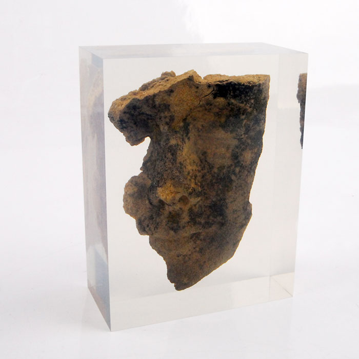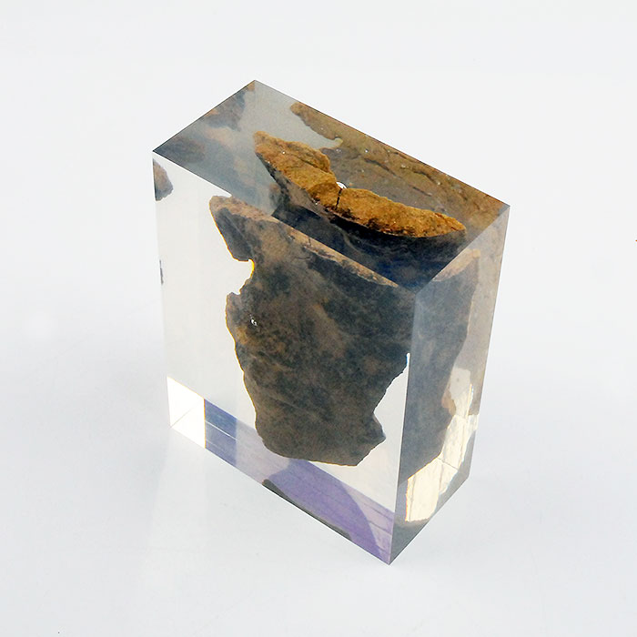 Fabrication artisanale de roche occluse avec résine transparente de format rectangulaire, objet appartenant à un client particulier.