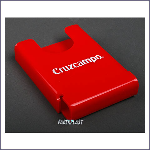 Porte brochure format murale support pour CRUZCAMPO marque. Fabriqué en acrylique plexiglas rouge (PMMA-methacrylate) et est marqué par un marquage sérigraphie entreprise.