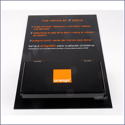 Porte brochure plexiglas format pour fixation murale. Fait sur ??mesure pour les entreprises ORANGE plaques avec plexi noir (plexiglas, pmma) textes imprimés avec le logo de lentreprise et de la marque, grâce à limpression numérique directe.
