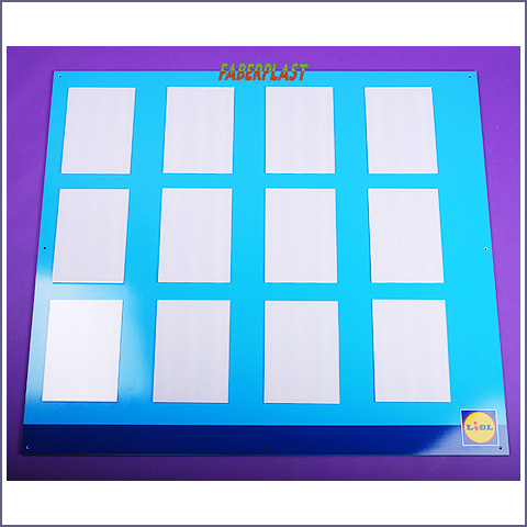 Panneaux de mur placement porte-lame de la marque LIDL médias. Fait Foamapan Blanc (mousse de PVC) et en acrylique transparent (plexiglas, PMMA). Marqué à limpression numérique et logo de lentreprise du client.