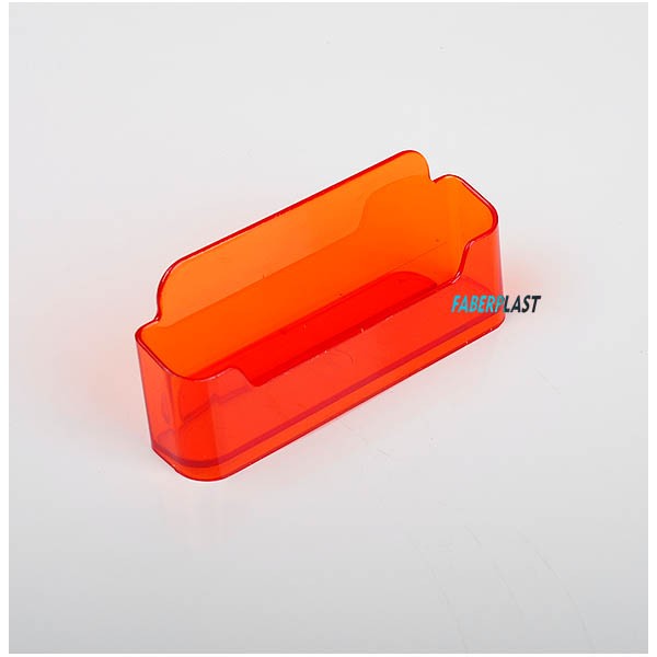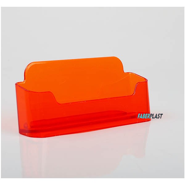 Porte visuelpour des cartes de visite en format horizontal, conçu pour être placé sur comptoir. Fabriqué en polystyrène orange translucide pour tous les types des visuels et cartes de visite de longueur maximale 10,5 cm (la hauteur de la carte de visite peut être variable, mais n’est pas recommandé d’utiliser des visuels de plus de 12 cm).