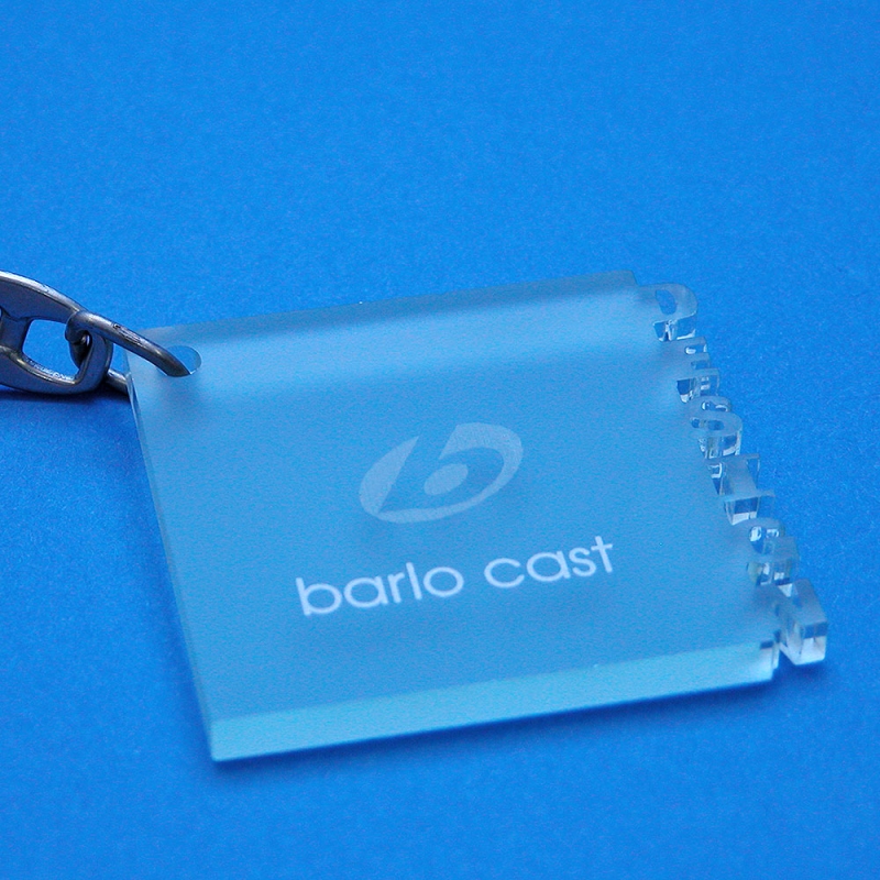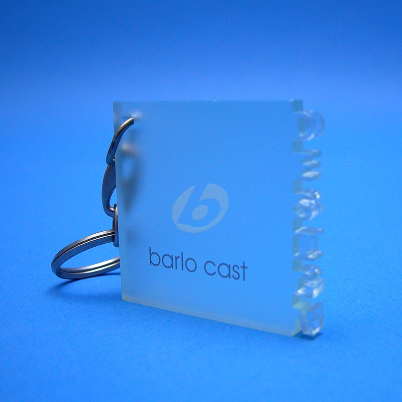 Porte clés plexiglas fait pour lentreprise BARLO CAST. Fait pour mesurer plaques teintées plexi translucide (Plexiglas, PMMA). Comprend lettres silhouette par découpe et gravure au laser.