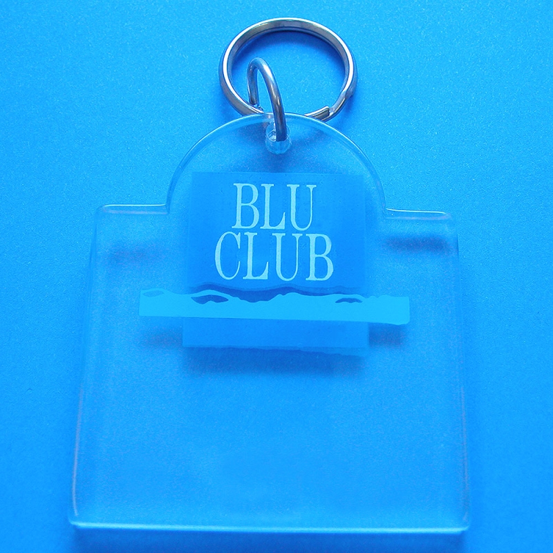 Porte clés plexiglas fait pour la marque BLU CLUB. Fabriqué en plaques transparentes plexi (plexiglas, pmma) imprimé avec de lespace dimpression numérique des noms personnalisés manuelles.