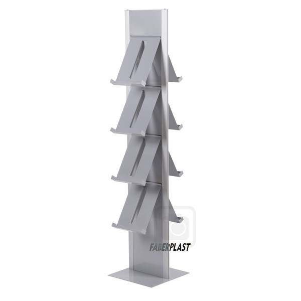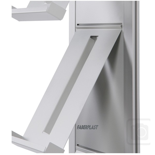 Formé par une structure métallique en finition argent et 4 fentes de chaque côté pour l'option recto-verso avec la possibilité de placer des étagères ou des poches de styrène transparent métalliques (ceux-ci doivent être commandés séparément en paquets de 2 unités) pour des brochures ou catalogues.