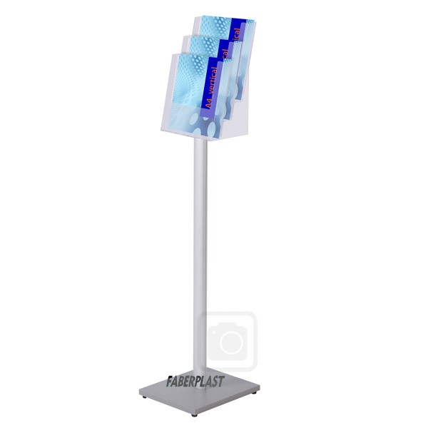 MODÈLE MB Porte Brochure A4 pour l'installation sur des surfaces. Formé par le pied métallique amovible en polystyrène transparent.