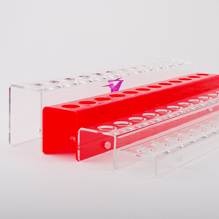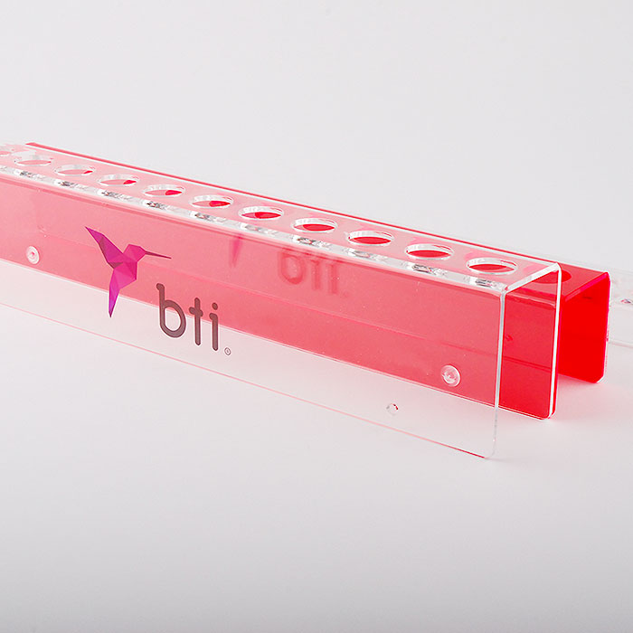 Fabrication artisanale ad hoc pour le placement de produits biomédicaux et autres de la marque. Fabriqué dans un format décalé avec des plaques de méthacrylate transparent et fuchsia translucide (Plexiglas-pmma) qui comprend une impression numérique directe du logo du client.
