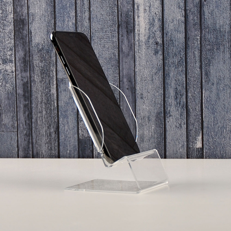 Présentoirs fabriqués dans nos ateliers en plaques de plexiglas acrylique (Plexiglas®-PMMA) faites à la main. Fabriqués en Espagne, ils sont munis d'un trou pour le passage du câble de recharge. Bords lisses et polis, incolores et très brillants grâce à nos techniques de travail méticuleuses.