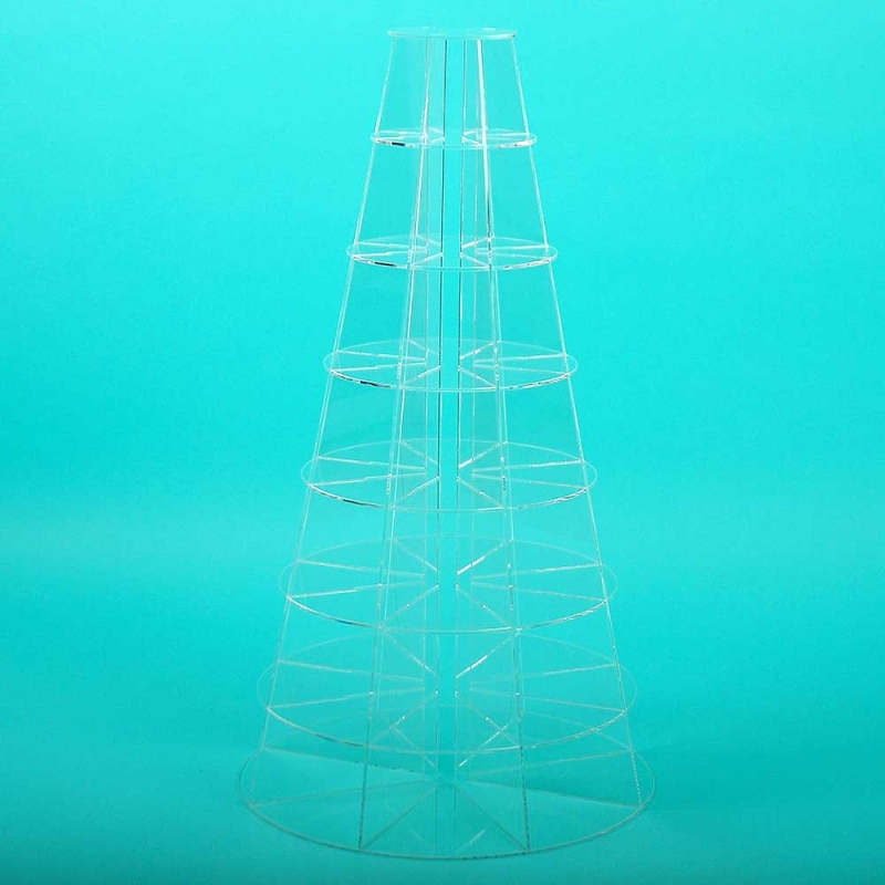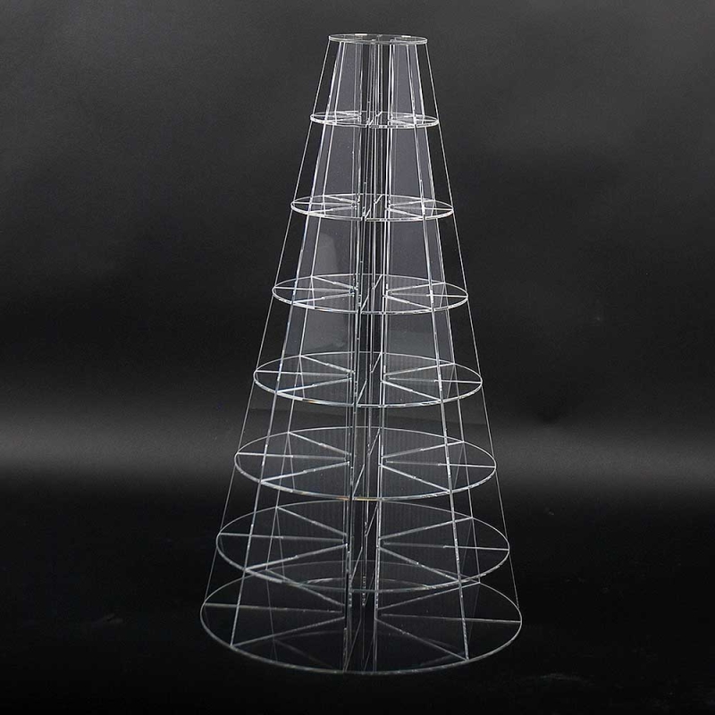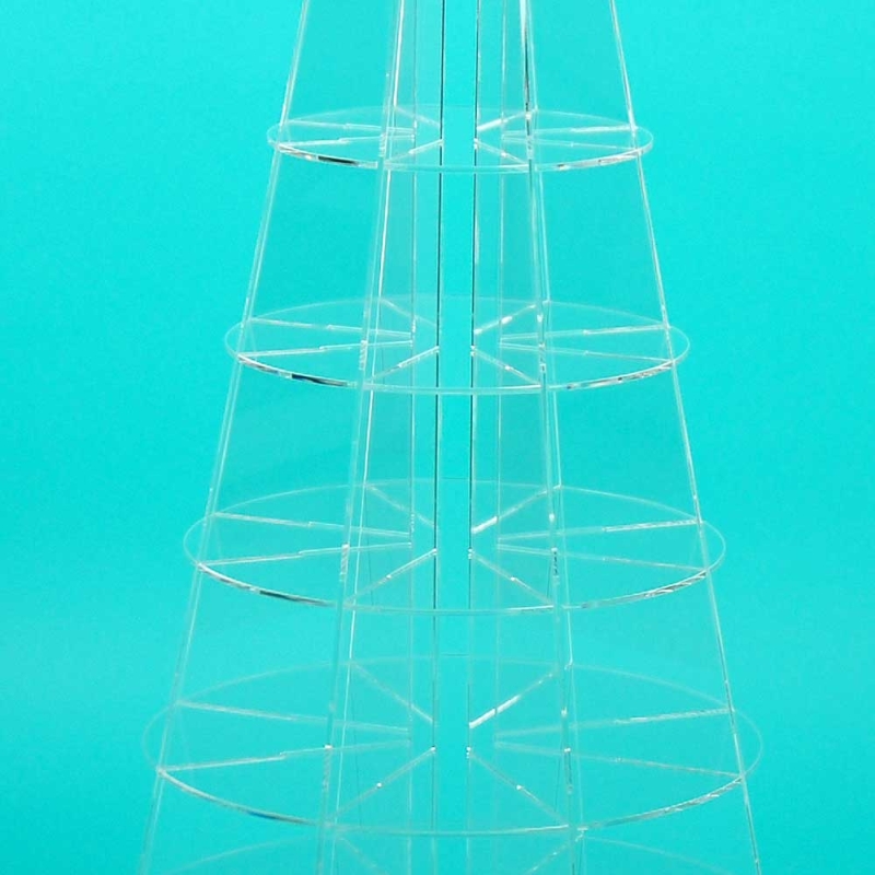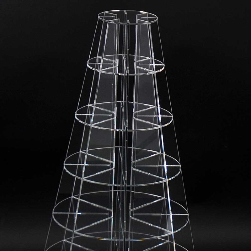 Ce présentoir vertical de forme pyramidale est entièrement réalisé sur mesure en méthacrylate (Plexiglas-PMMA) transparent de haute qualité, idéal pour présenter des produits de manière organisée, esthétique et offrant une visibilité optimale. Sa structure se compose d'un système modulaire de plusieurs niveaux circulaires, reliés par des colonnes assurant une excellente rigidité et une répartition uniforme du poids.