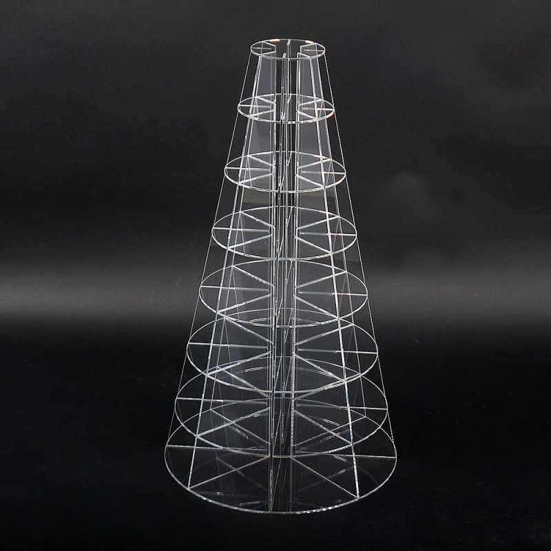 Grâce à sa forme conique et à sa disposition en quinconce à différentes hauteurs, le présentoir maximise l'impact visuel à 360°, permettant aux clients de se déplacer naturellement autour du produit. Sa transparence minimise l'impact visuel de la structure, mettant ainsi en valeur uniquement les articles exposés.
