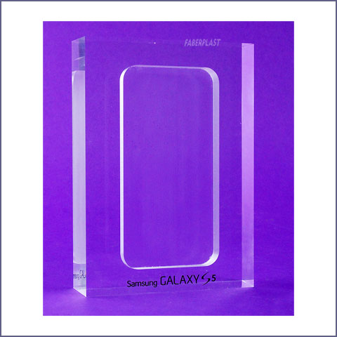 Bloc presentoir dans exposant le format SAMSUNG GALAXY. Pris sous forme de plaques de plexi transparent (Plexiglas-PMMA) haute trou épaisseur à la borne. Comprend logo et le texte décoration impression digitale directe.