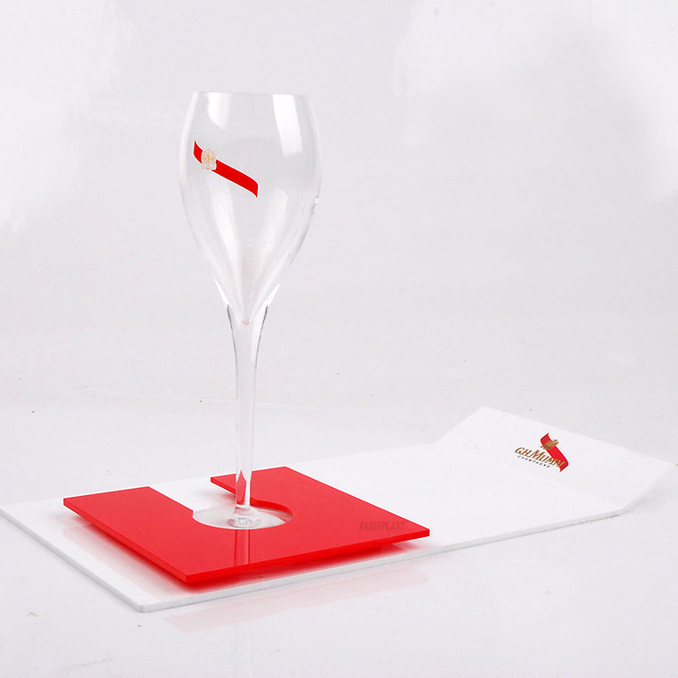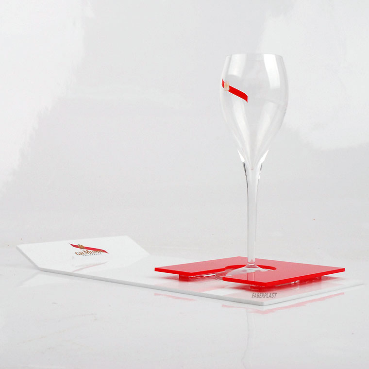 Pour le verre de champagne et de la publicité de marque de soutien sur-mesure, des plaques profilant par laser méthacrylate transparent (Plexiglas-PMMA) et rouge méthacrylate haute brillance (Plexiglas-PMMA). Décoré avec le logo du client par l'impression digitale directe de haute qualité.