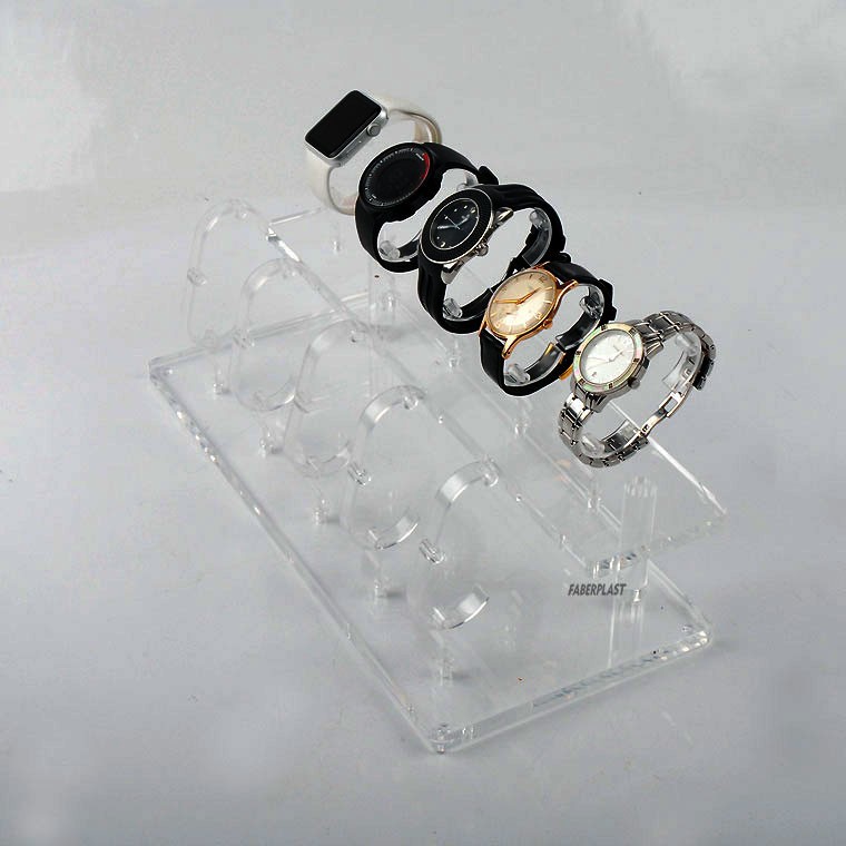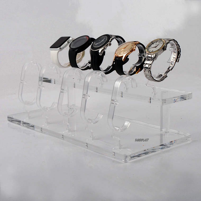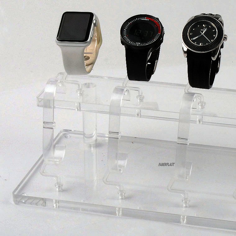 Présentoir en méthacrylate fabriqué sous forme de table ou de comptoir pour le placement, l’exposition et la vente au public de montres-bracelets, dans un format de 10 unités de toute taille.