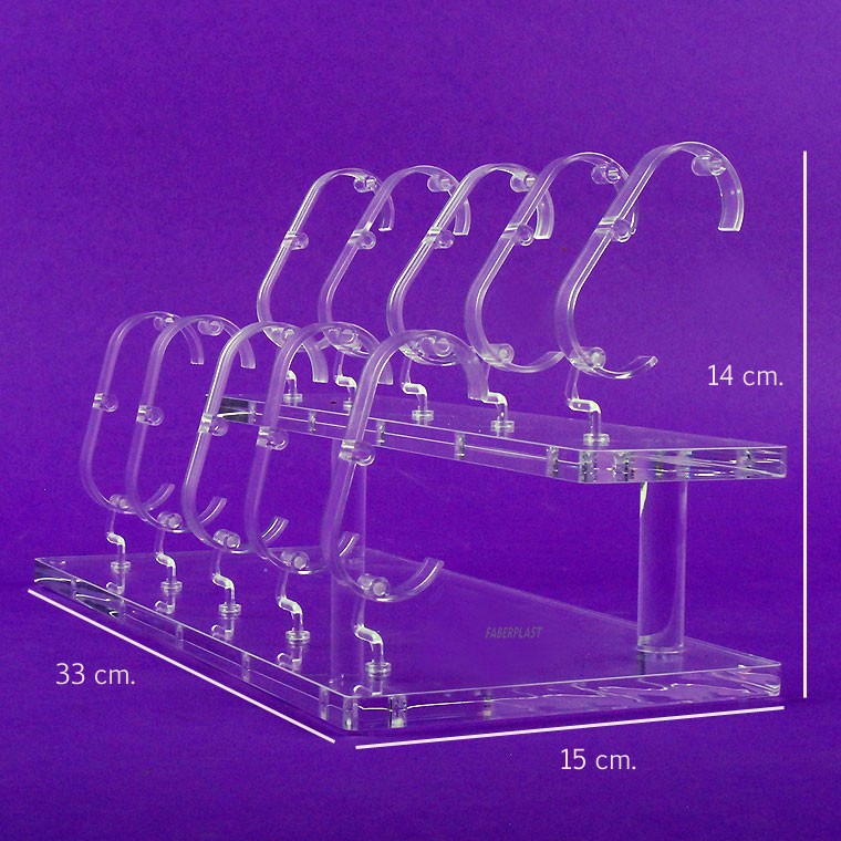 Fabriqué avec des plaques en méthacrylate transparent (Plexiglas-PMMA) et composé d'un système spécial de pièces ajustables qui permet de placer des tailles de bracelets de tout type, grâce à quoi il s'adapte à toutes les tailles possibles. Construit en deux hauteurs pour permettre une visualisation adéquate de tous les modèles d'escalier, avec 5 unités dans chaque rangée.