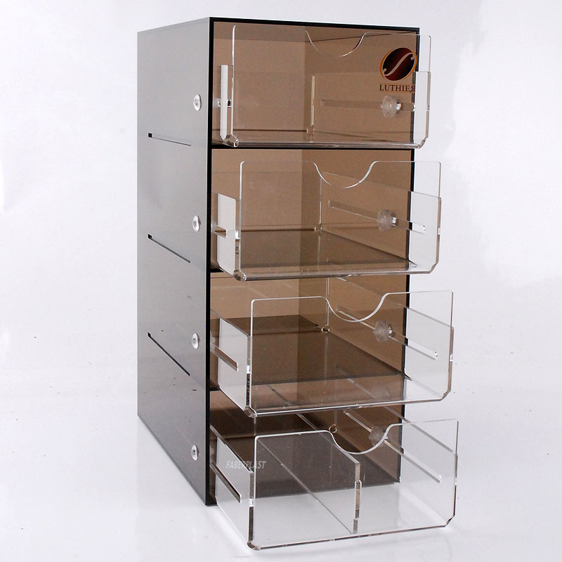 Fabriqué avec des plaques de méthacrylate brun transparent et translucide (Plexiglas-pmma), avec impression digitale directe du logo de la marque. Présentoir avec petite forme de meuble avec 4 tiroirs pour le placement de produits.