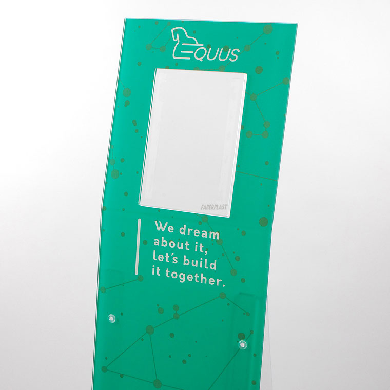 Présentoir plexiglas format pour des surfaces sur mesure pour la marque EQUUS. Panneaux en méthacrylate transparent (Plexiglas-PMMA) et l'étiquetage d'impression adhésif digitale avec la conception du client et le logo. Il comprend l'affichage de porte-lame sur le dessus pour placer des informations publicitaires ou format A4.