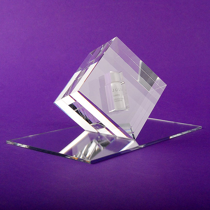 Présentoir en méthacrylate de petit format exclusif et original pour table ou comptoir sur mesure pour la marque de parfum JÚLIA.