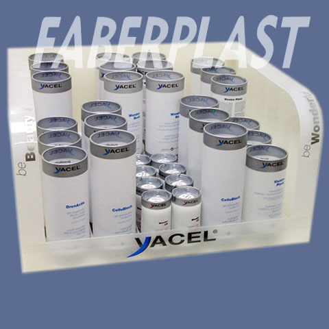 Présentoir plexiglas PLV YACEL pour les parfums à base de glace blanche méthacrylate ( Plexiglass - PMMA ) avec des encres sérigraphiques trois.