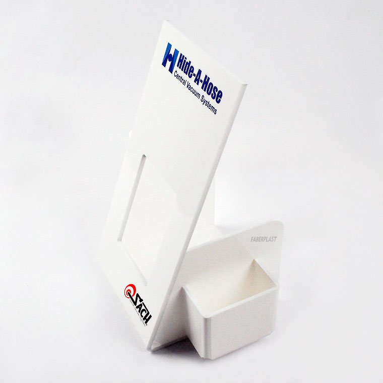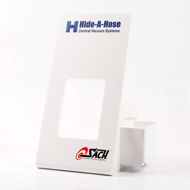 Présentoir plexiglas en format de table ou de comptoir, sur mesure pour les produits et informations de la marque SACH Central Vacuum Systems.