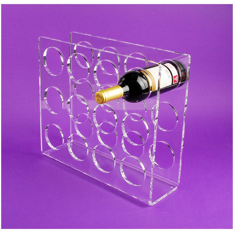 Présentoir PLEXIGLAS VIN FLOKY bouteilles de vin en rack 3/4 litre de soutien. Fait de plaque acrylique plexi transparent de 10 mm. d'épaisseur (Plexiglas-PMMA). Haute résistance.