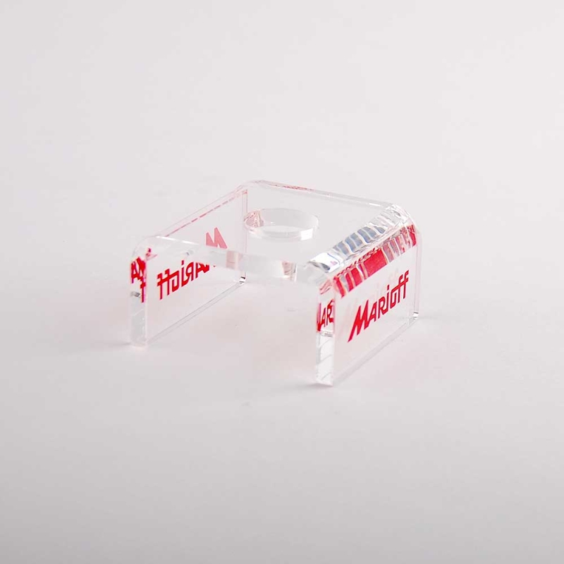 Petit support transparent en acrylique (Plexiglas®-PMMA) destiné à l'installation dans les systèmes industriels MARIOFF. Cette pièce est usinée à l'aide de lasers de haute précision. Elle intègre un logo imprimé numériquement avec des encres ECO-UV de haute qualité et durables, offrant une clarté et une profondeur de couleur exceptionnelles. Les bords sont lisses et polis pour une finition ultra-brillante et incolore.