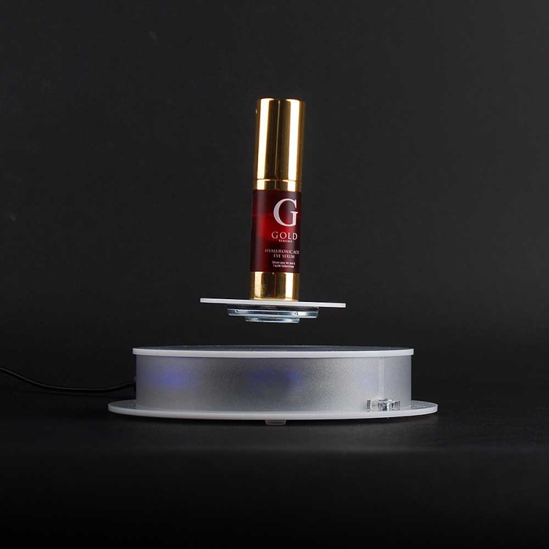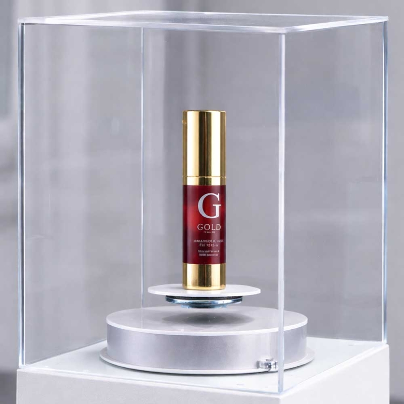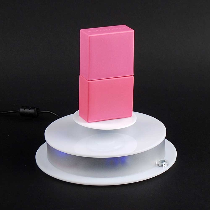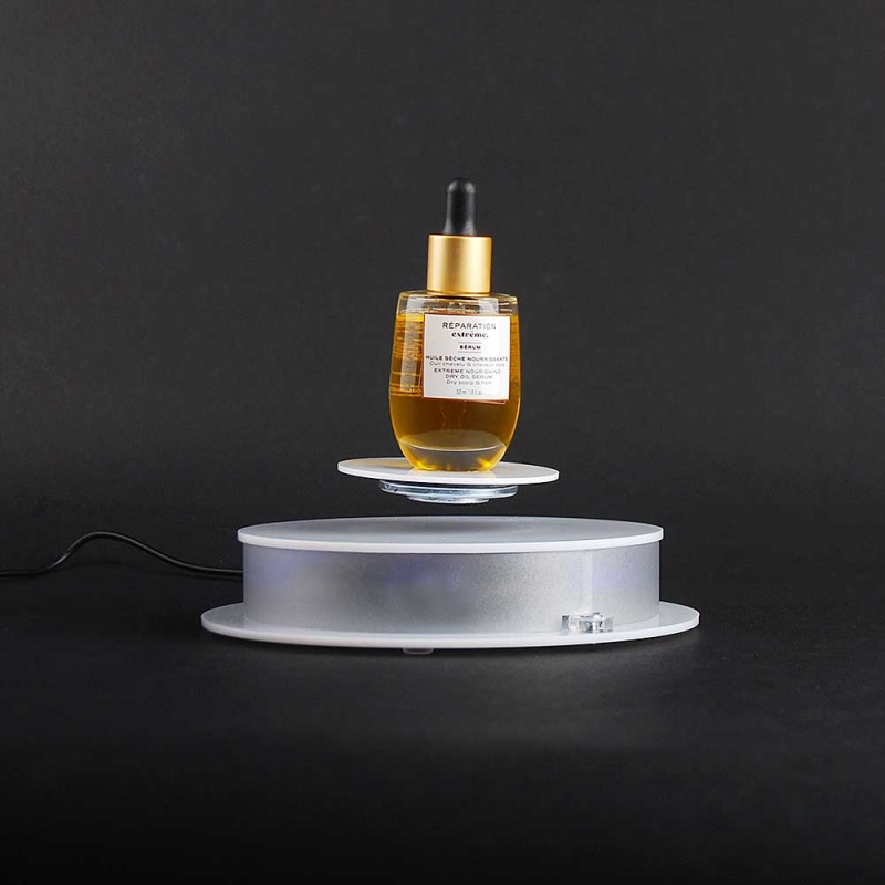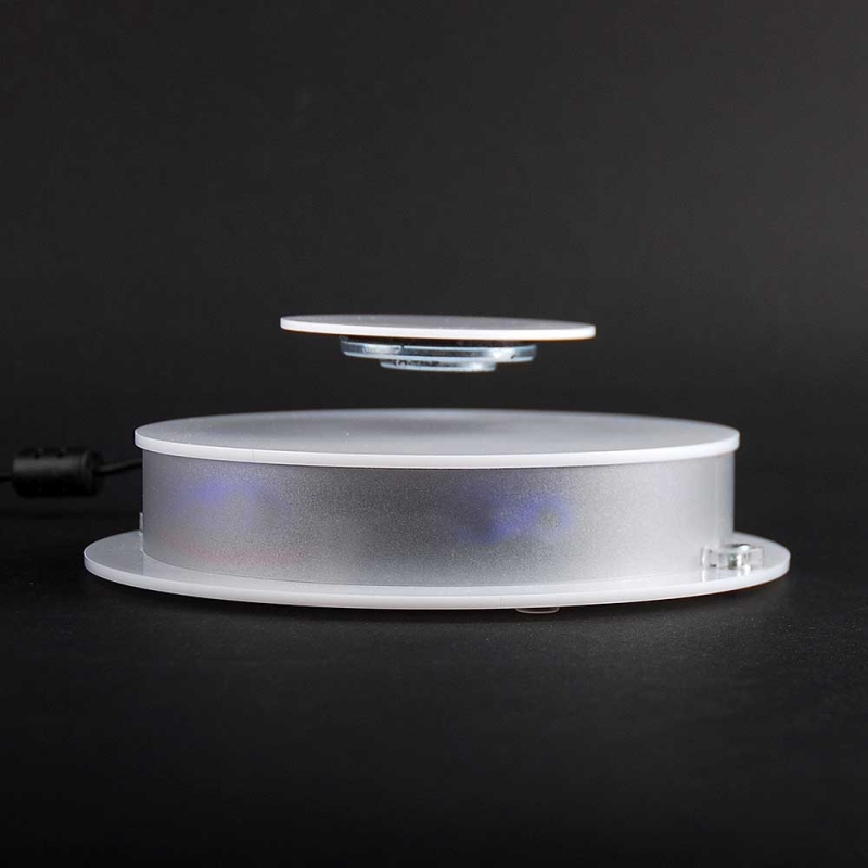 Socle circulaire en méthacrylate pour lévitation magnétique d'objets, conçu pour une présentation de produits percutante et innovante. Grâce à son système électromagnétique, l'objet est suspendu dans les airs, tournant doucement et captivant immédiatement le regard.