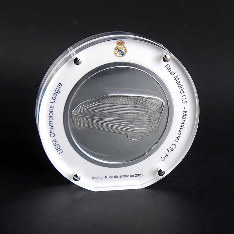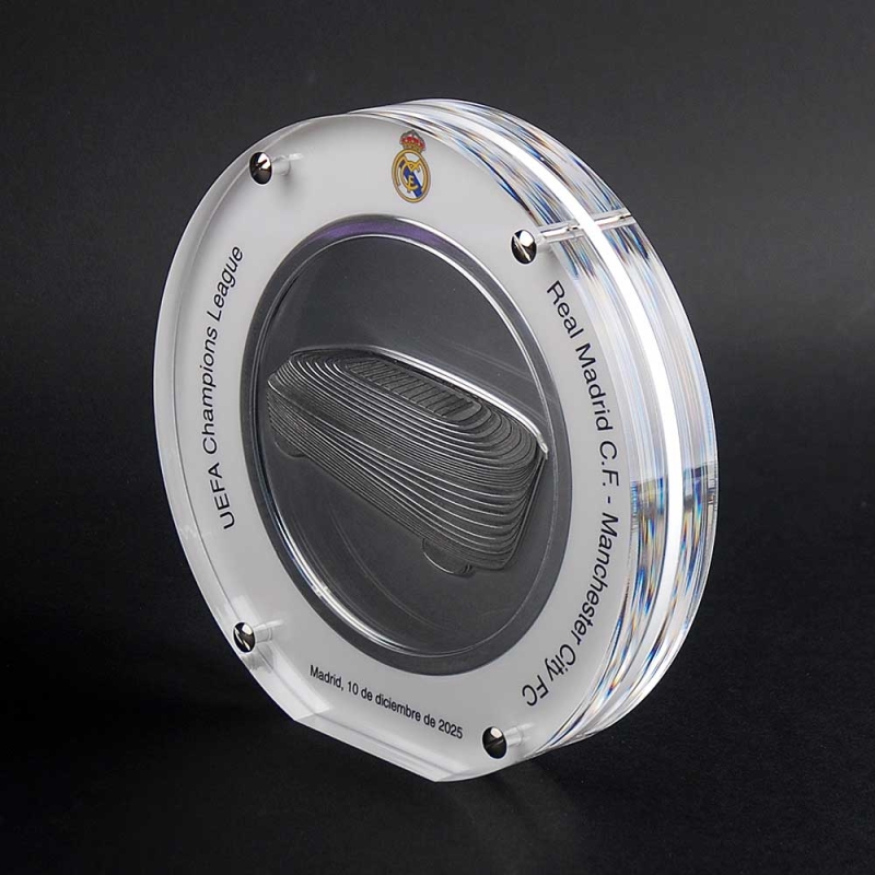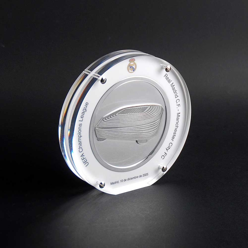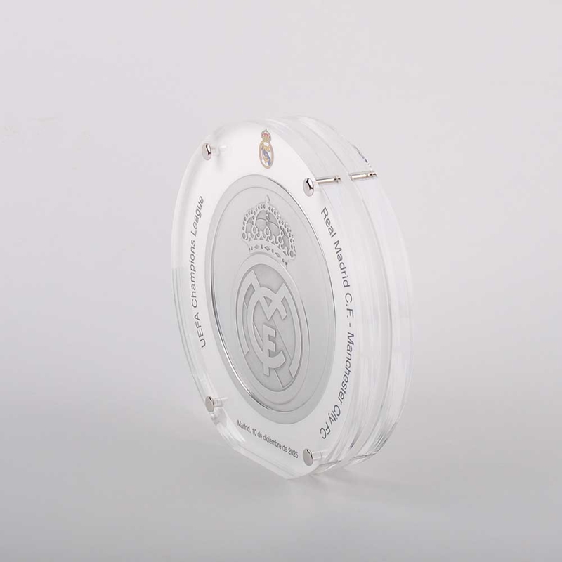 Un élégant bloc circulaire en méthacrylate, idéal pour les récompenses sportives, les événements institutionnels et les occasions prestigieuses. Fabriqué en méthacrylate transparent de haute qualité (Plexiglas®-PMMA), il est composé de plusieurs couches assemblées par des entretoises métalliques, offrant profondeur, solidité et une finition haut de gamme.