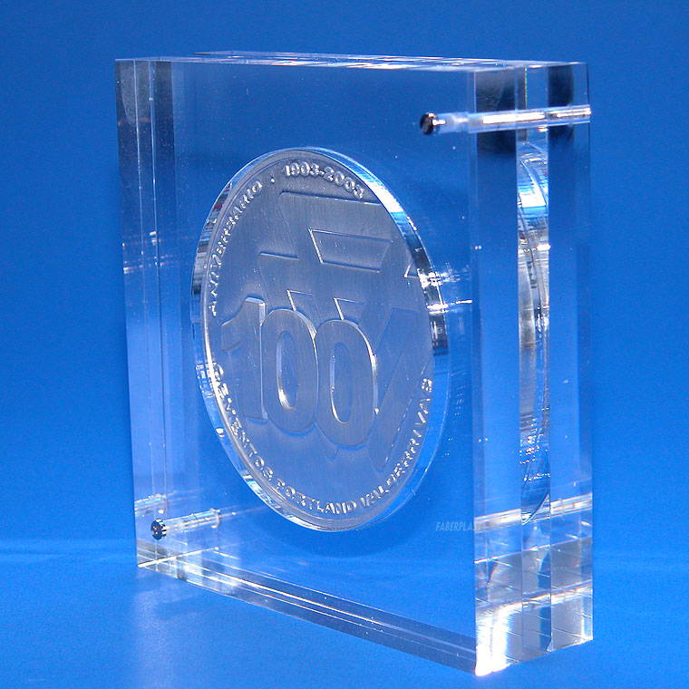 Article de cadeau d'entreprise exclusif à l'occasion du 100e anniversaire de l'entreprise. Pièces en plaques de méthacrylate transparentes (Plexiglas-pmma) découpées au laser, enfermées à la main pour le placement de la pièce d’argent et reliées par des épingles en argent.