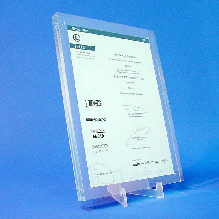 Fabriqué avec des plaques de méthacrylate (Plexiglas-pmma) de grande épaisseur pour exposer, fixer et conserver un document de diplôme sur un côté, avec une base en méthacrylate et réunie par des broches en acier.
