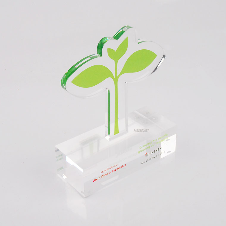 Trophée plexiglas faite à la société HEINEKEN. Panneaux en méthacrylate transparent (Plexiglas-PMMA) se profilant laser en forme selon la demande du client. Décoré avec logo directe d'impression digitale, texte et société de conception.