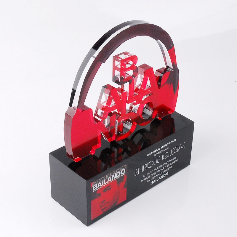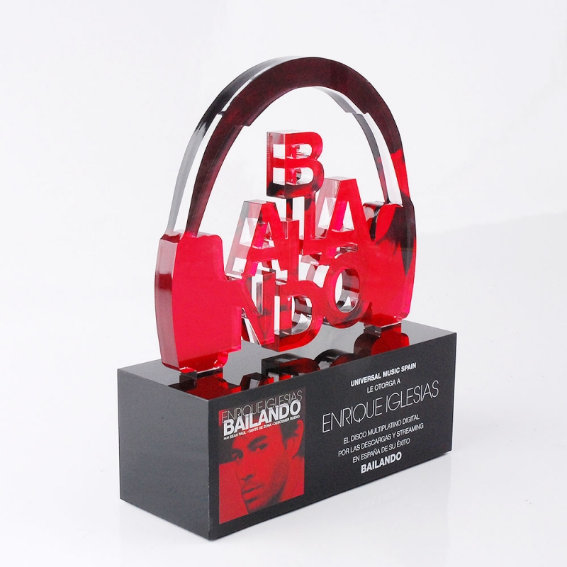 Trophée 2 plexiglas faite pour les prix de Universal Music. attribué Enrique Iglesias:http://www.enriqueiglesias.com/ Fabriqué en plaques transparentes et acrylique plexi noir (Plexiglas-PMMA) laser silhouette et décoré avec limpression digitale directe í haute résolution. Modí¨le 2 conception fourni par le client.