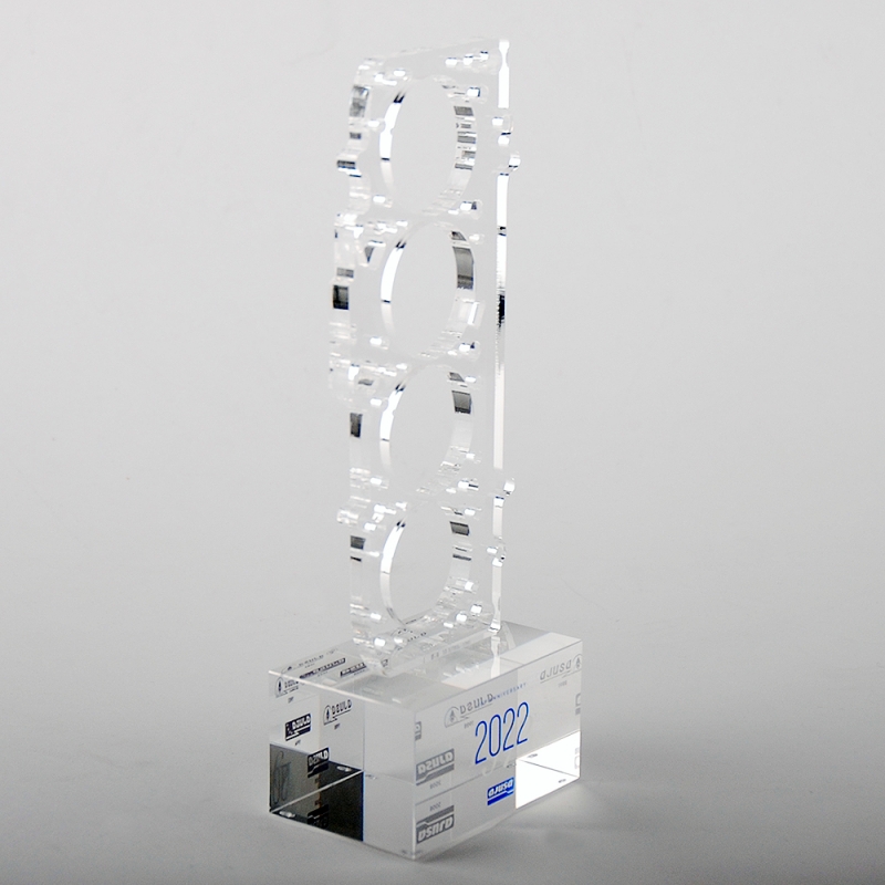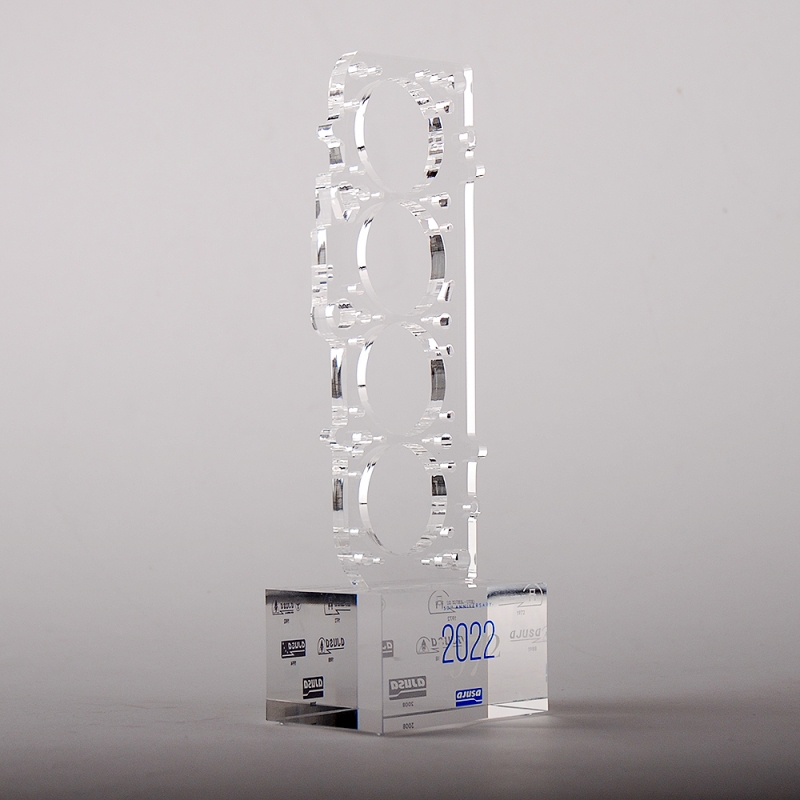 Trophée en plexiglas acrylique réalisé ad hoc pour le 50e anniversaire de la société AJUSA.