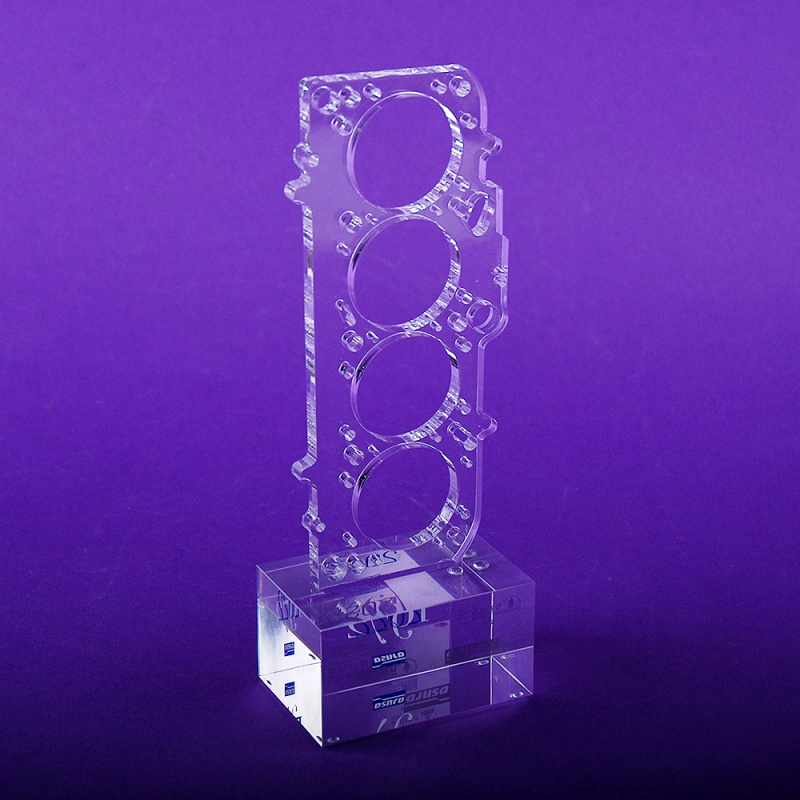 Trophées en forme de joint de culasse silhouettés au laser de haute précision et fabriqués à la main avec des plaques et des blocs de méthacrylate de haute épaisseur (Plexiglas®-PMMA) dans nos propres ateliers. Fabriqué en EU. Avec une impression numérique et des encres ECO-UV de haute qualité, des couleurs nettes et profondes fidèles au design fourni par le client. Bords incolores lisses et polis à haute brillance grâce à nos techniques de travail méticuleuses.