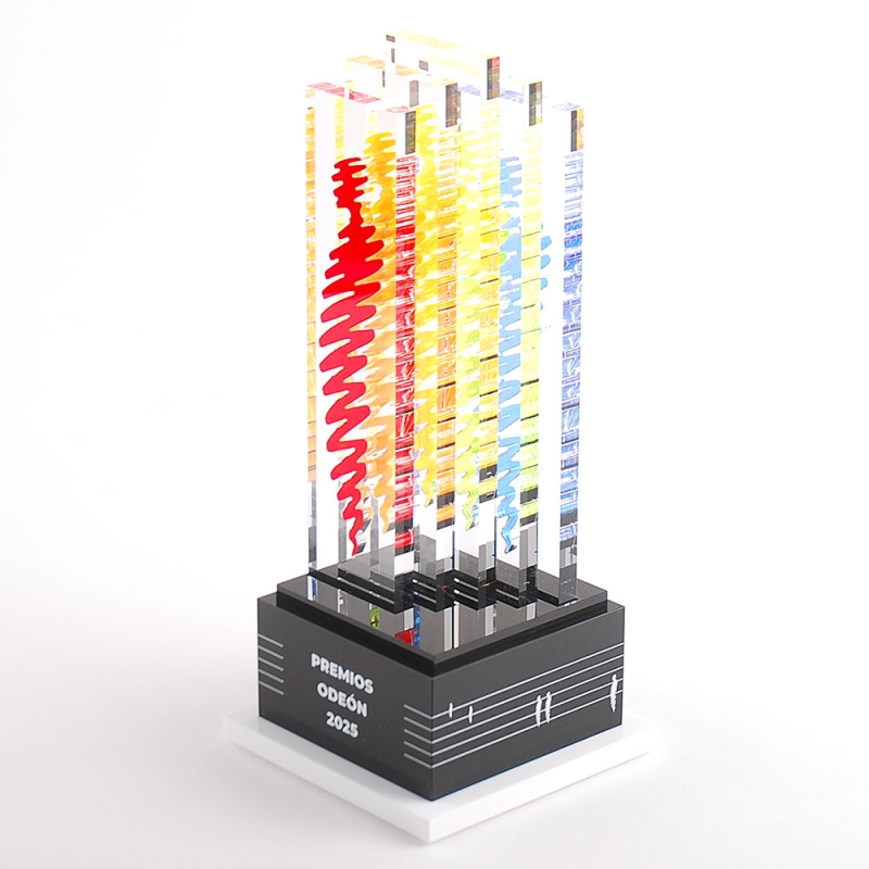 Trophées en plexiglas réalisés ad hoc pour les prix ODEON.