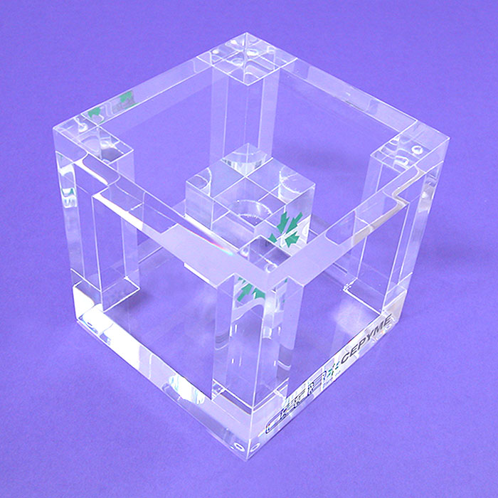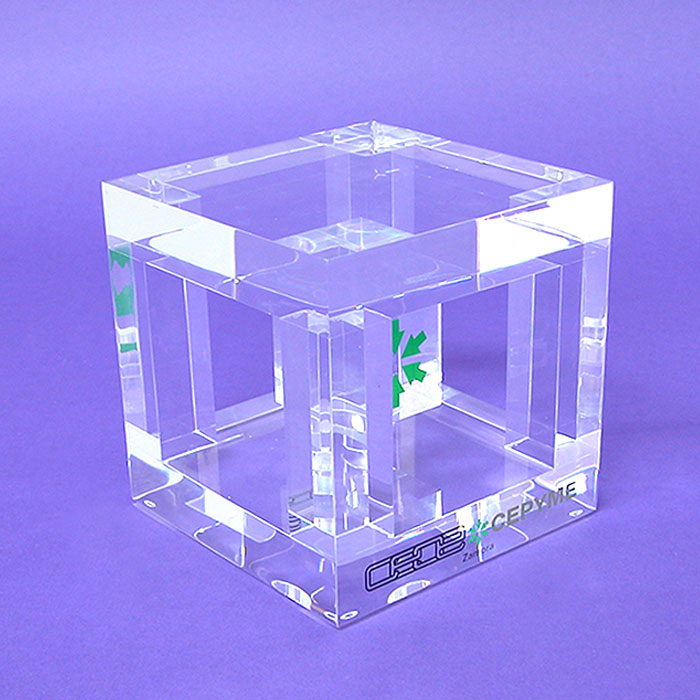 Trophée ZAMORA de la CEOE, réalisé en Plexiglas (pmma-méthacrylate) transparent et imprimé en impression numérique directe.