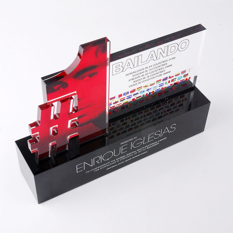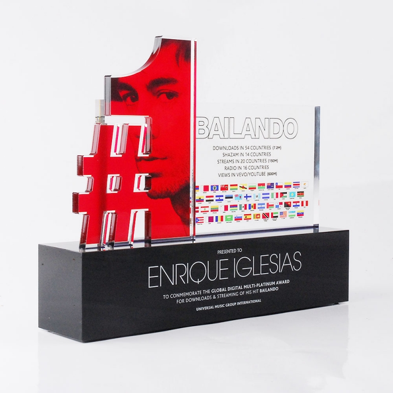 Trophée en méthacrylate réalisé ad-hoc à l'occasion de la remise du prix au chanteur ENRIQUE IGLESIAS.