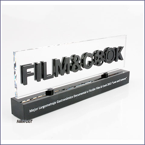 Trophée acrylique plexiglas faite pour lévénement et gala FILM & COOK 2013. Récompenses comme made in acrylique plexi transparent et acrylique plexi noir (Plexiglas-PMMA). Limpression numérique directe attributions à base.
